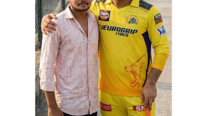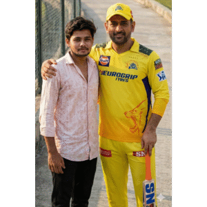 Use both uploaded images and create a single hyper-realistic photo. Merge the first person (MS Dhoni) and the second person (me) into a natural half-hug pose. Place them standing side by side with Dhoni’s arm around my shoulder and my arm lightly around his back. Make the lighting, skin texture, shadows, sharpness, and color tones perfectly consistent so that it looks like an original photo taken on a DSLR, not AI-generated. Keep the background simple and realistic, like a stadium walkway, training area, or neutral outdoor location. Make sure both faces look exactly like the uploaded images — no alteration. Final output must look 100% real, clean, high-resolution, and indistinguishable from an actual photograph.