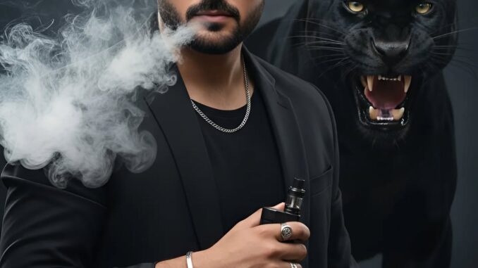 Pose: He is positioned in a 60-degree downward angle with a dramatic, cinematic presence. His long hair is swept neatly backward, maintaining the same hairstyle as in the reference image. He holds a vape in his hand, releasing a dense cloud of smoke that drifts to the side. His expression is intense yet composed, with a slight, calm demeanor and no visible teeth. He wears stylish black sunglasses that enhance his bold, mysterious look.