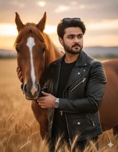 Ultra-realistic, hyper-detailed, 8K cinematic portrait of a young stylish man, using the uploaded image for exact face and hairstyle. Outfit: Black leather jacket over a black t-shirt, accessorized with a wristwatch, styled fashionably with attention to textures and fit. Sunglasses placed on his hair. Pose: Standing in a golden wheat field at sunset, face turned slightly to the side, gently holding and touching a brown horse with a white mark on its forehead. Confident posture highlights sharp jawline and composed demeanor. The horse stands close, calm and elegant. Background: Warm golden sunlight illuminating soft clouds and distant hills, cinematic atmosphere with dramatic lighting, natural textures, and depth of field. Ultra-realistic 8K quality, fashion photography style, professional lens effect emphasizing face and hair details with high clarity.