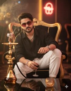 Background: A luxurious Dubai club interior glowing with ambient golden and red neon lighting. Soft reflections shimmer across the sleek table surface and glass decor, while subtle hookah smoke drifts through the air. The background remains softly blurred to keep full focus on his stylish, confident presence, amplifying the cinematic mood of luxury and swagger.