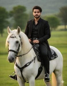 Pose: Sitting upright on a majestic white Friesian horse with intricately detailed black leather saddle and western style accents. Shoulders squared, posture commanding yet relaxed, gaze directly engaging the camera with calm confidence, radiating presence and magazine-cover charisma.