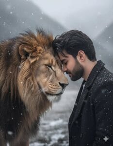 Pose: Standing face-to-face with a majestic lion, eyes closed, serene expression, gently resting forehead and a single arm on the lion’s, conveying trust and a spiritual bond. Lion displays a thick, detailed mane, posture calm and majestic.