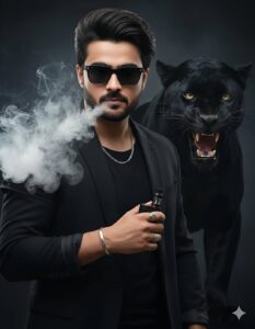 Background: A dark, blurred backdrop with soft, moody lighting and a shadowy atmosphere. Behind him stands a black panther with an aggressive, powerful expression, its eyes glowing faintly to add a fierce and cinematic tone to the composition.