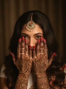 Smooth, delicate skin. The matte, earthy, and finely textured surface of the dried henna patterns. Her hair appears soft and voluminous. Her red fingernails have a glossy, reflective texture. The maang tikka features the varied textures of metalwork and polished gemstones/pearls.