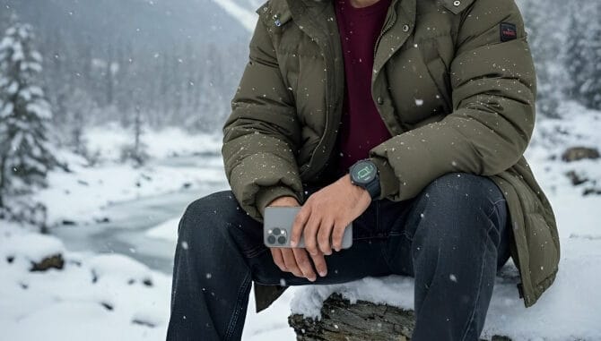 Create Ultra-realistic 8k full-size cinematic portrait of a man sitting gracefully in the snowy landscapes of Jammu & Kashmir. He wears premium winter fashion-fur-lined puffer jacket, maroon t-shirt, baggy jeans, leather trekking boots, touch circle watch, iphone 16pro max in hand and green circle sunglasses. He is seated on a snow-covered rock or bench one leg slightly bent, hands relaxed naturally, with a confident yet relaxed posture. Snow gently falls around him, with majestic. Use the same face