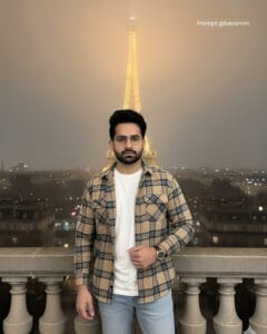 Face unchanged from uploaded image, create a handsome man with dark hair and a neatly trimmed beard (like the subject in the first image) stands on an elegant stone balcony overlooking a foggy city night. He is wearing a tan, blue, and brown plaid flannel shirt open over a plain white t-shirt, with light wash denim jeans. He has a classic brown leather watch on his left wrist. The background is Paris, with the Eiffel Tower illuminated in a soft golden glow, partially obscured by the mist. Soft, use the same face.